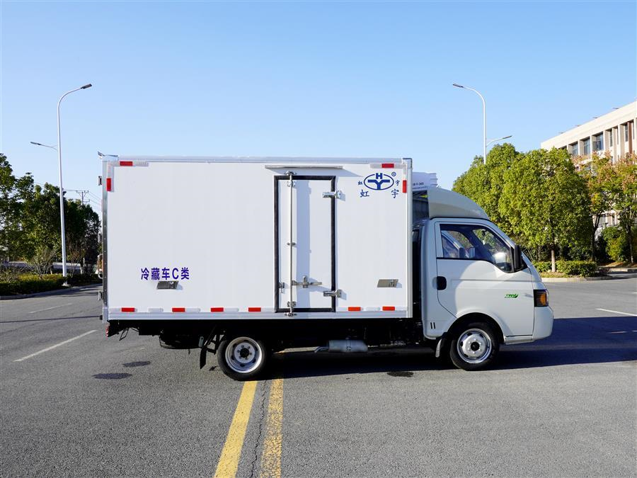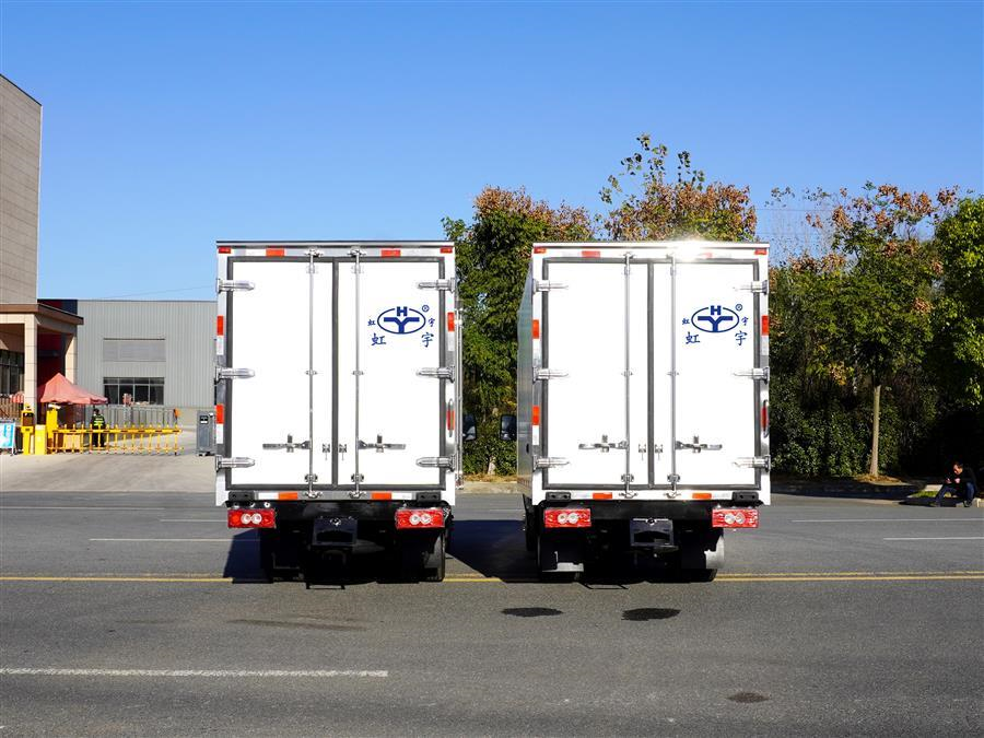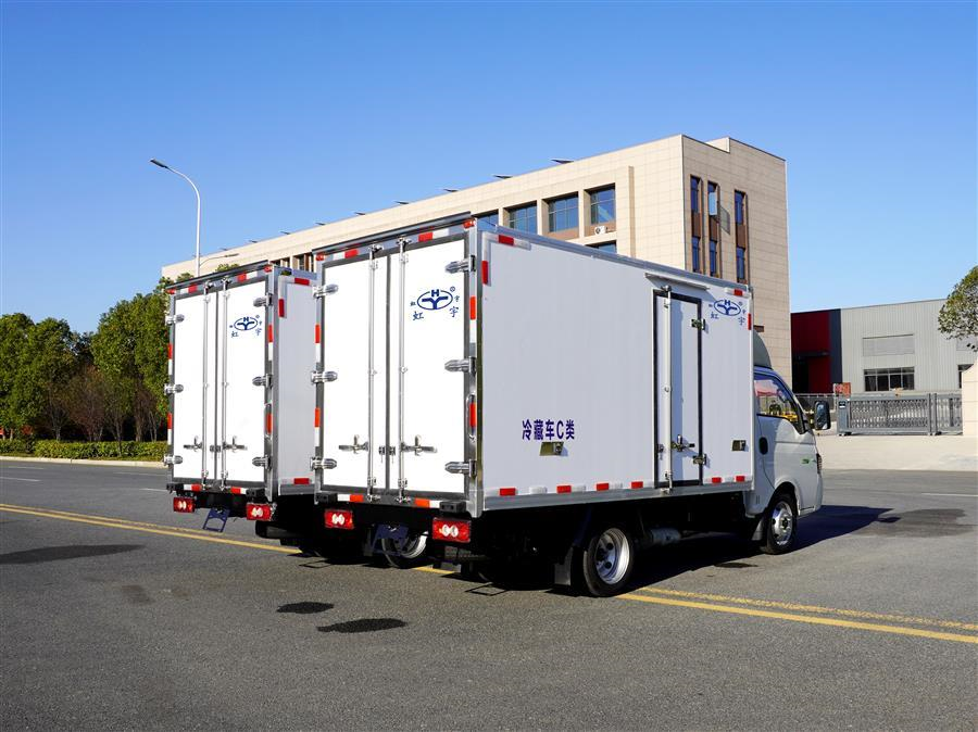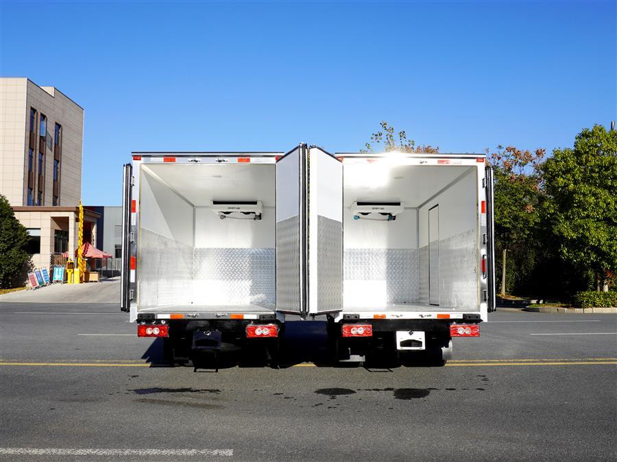 冷藏车厢体为全密封厢板结构,采用完整的2.8mm优质哑光玻璃钢进行板材封闭,具有均衡的结构强度,厢板内部骨架使用断桥隔温处理工艺的加强筋,大幅度提高厢体整体强度;内部填充高密度聚氨酯发泡材料,厢板整体为三明治结构,厢体具有优异的保温特性;