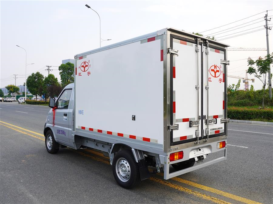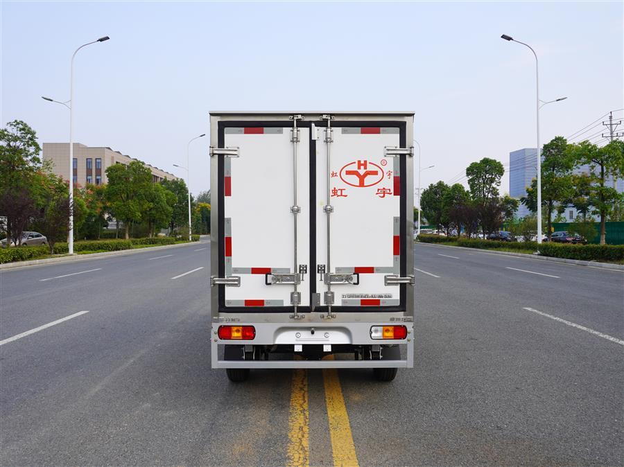 冷藏车厢体为全密封厢板结构,采用完整的2.8mm优质哑光玻璃钢进行板材封闭,具有均衡的结构强度,厢板内部骨架使用断桥隔温处理工艺的加强筋,大幅度提高厢体整体强度;内部填充高密度聚氨酯发泡材料,厢板整体为三明治结构,厢体具有优异的保温特性;