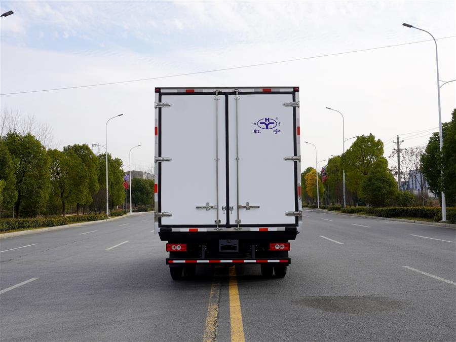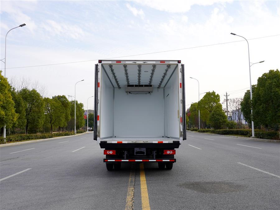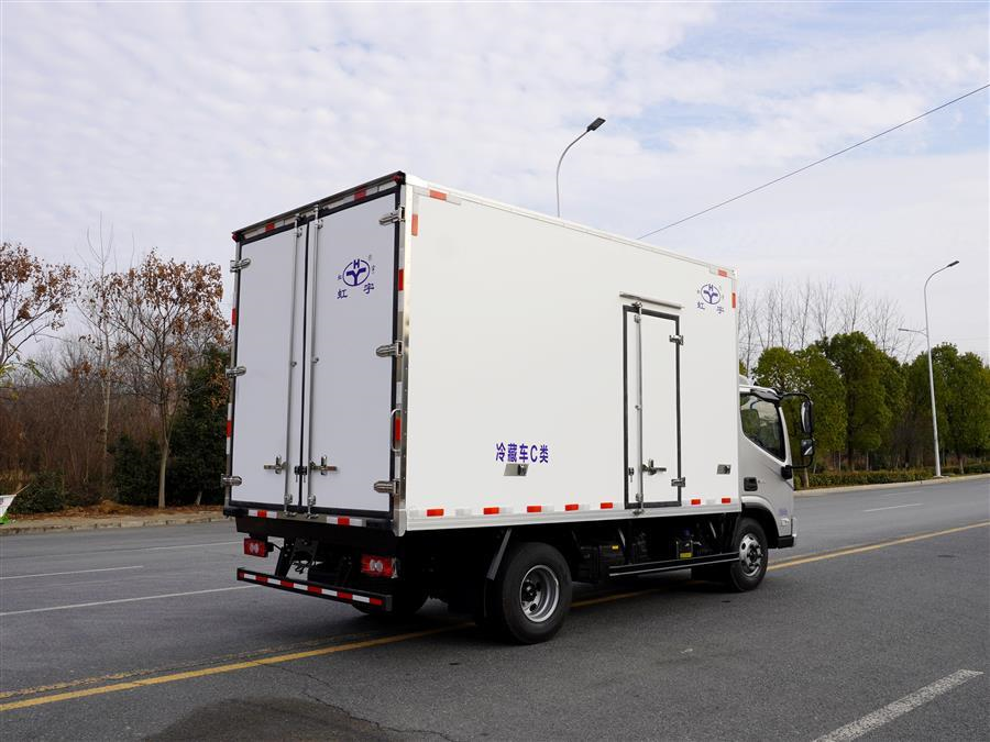 冷藏车厢体为全密封厢板结构,采用完整的2.8mm优质哑光玻璃钢进行板材封闭,具有均衡的结构强度,厢板内部骨架使用断桥隔温处理工艺的加强筋,大幅度提高厢体整体强度;内部填充高密度聚氨酯发泡材料,厢板整体为三明治结构,厢体具有优异的保温特性;
