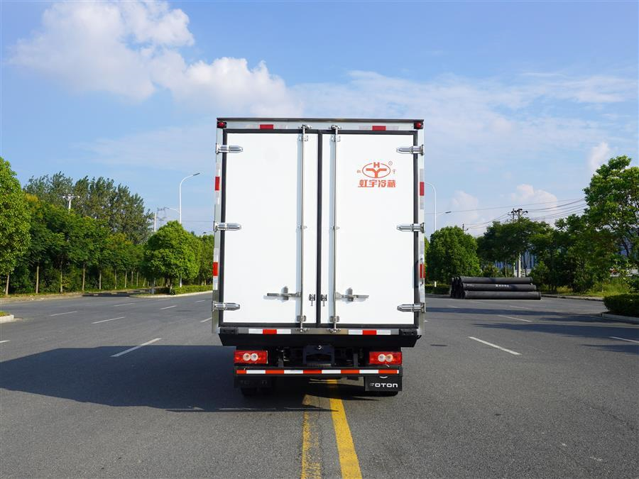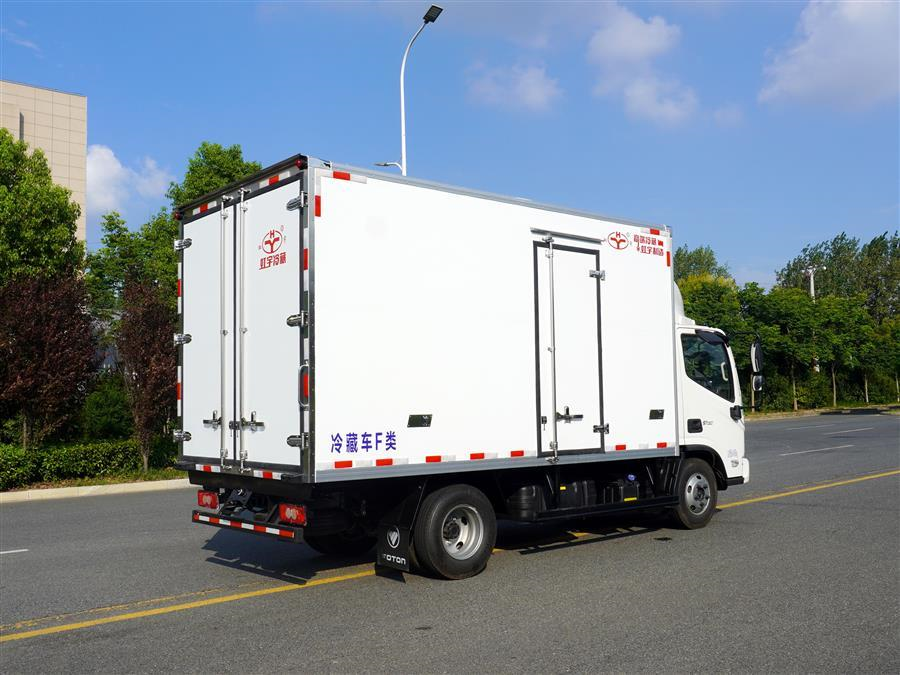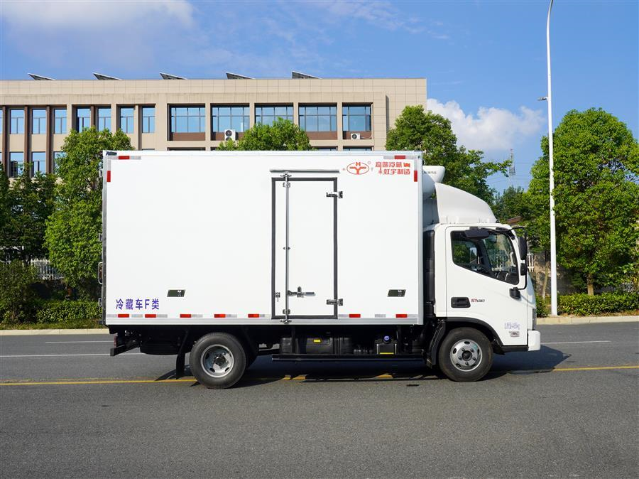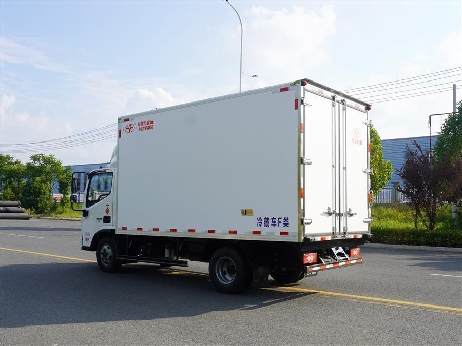 冷藏车厢体为全密封厢板结构,采用完整的2.8mm优质哑光玻璃钢进行板材封闭,具有均衡的结构强度,厢板内部骨架使用断桥隔温处理工艺的加强筋,大幅度提高厢体整体强度;内部填充高密度聚氨酯发泡材料,厢板整体为三明治结构,厢体具有优异的保温特性;