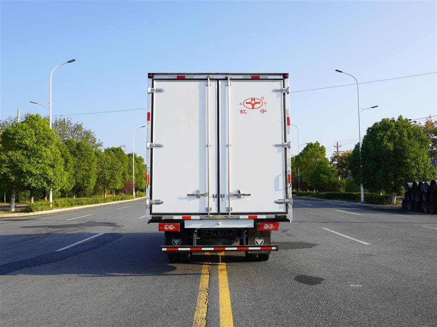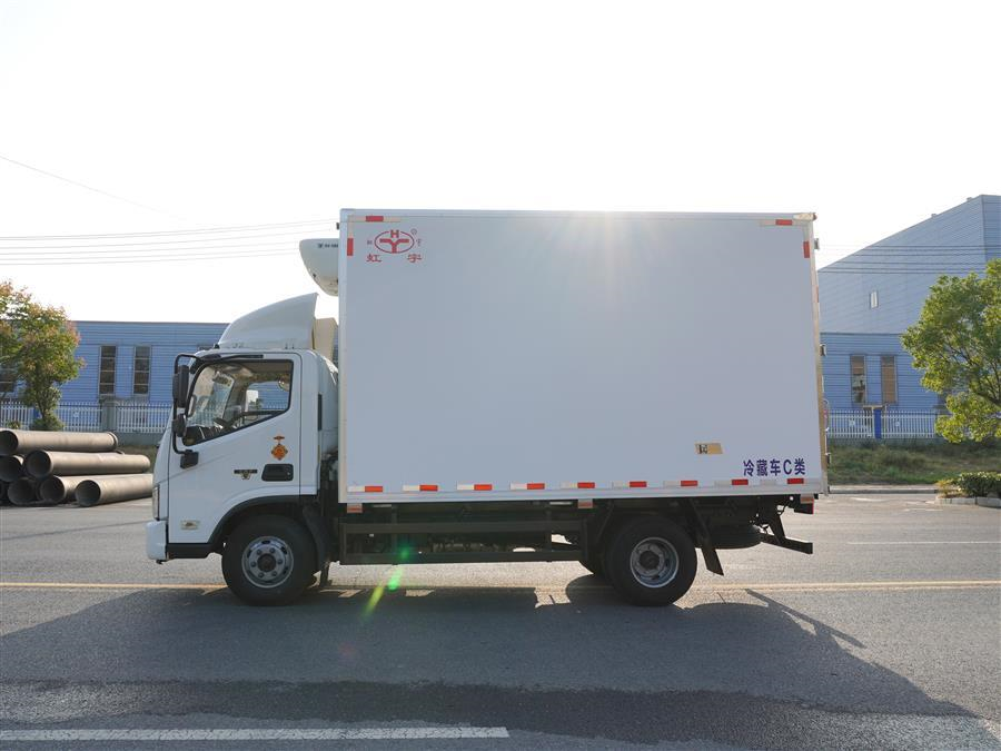 冷藏车厢体为全密封厢板结构,采用完整的2.8mm优质哑光玻璃钢进行板材封闭,具有均衡的结构强度,厢板内部骨架使用断桥隔温处理工艺的加强筋,大幅度提高厢体整体强度;内部填充高密度聚氨酯发泡材料,厢板整体为三明治结构,厢体具有优异的保温特性;
