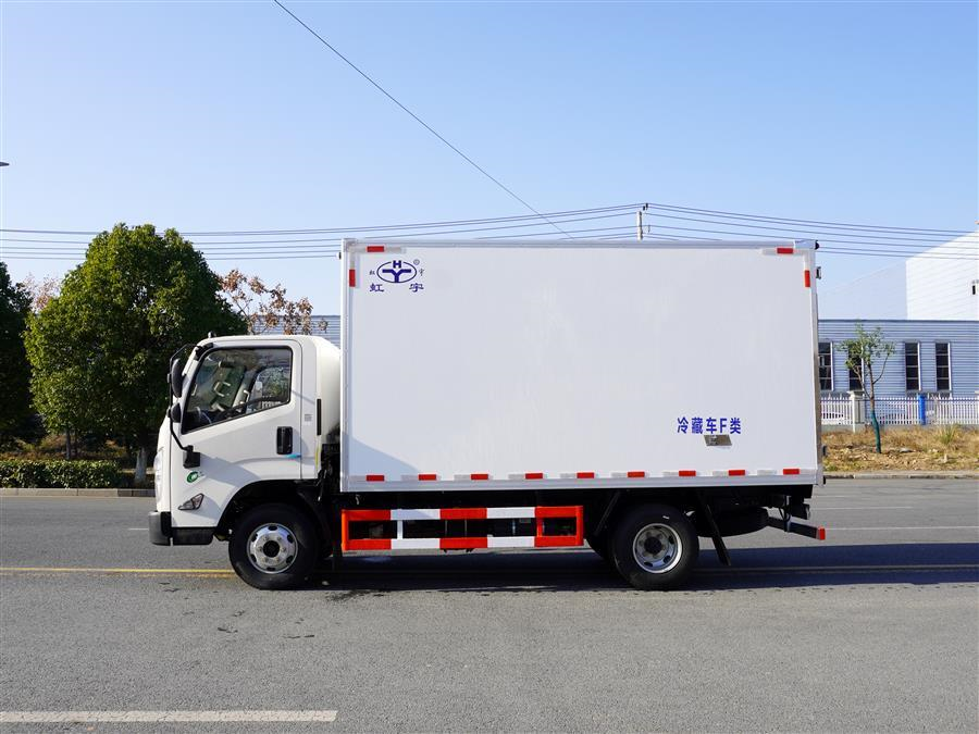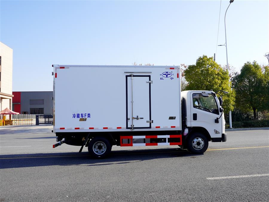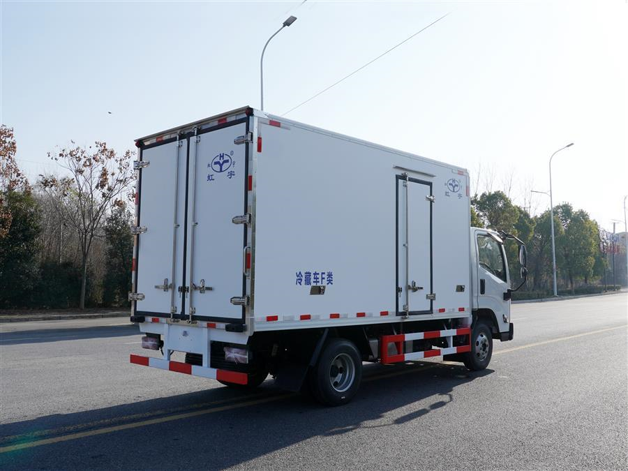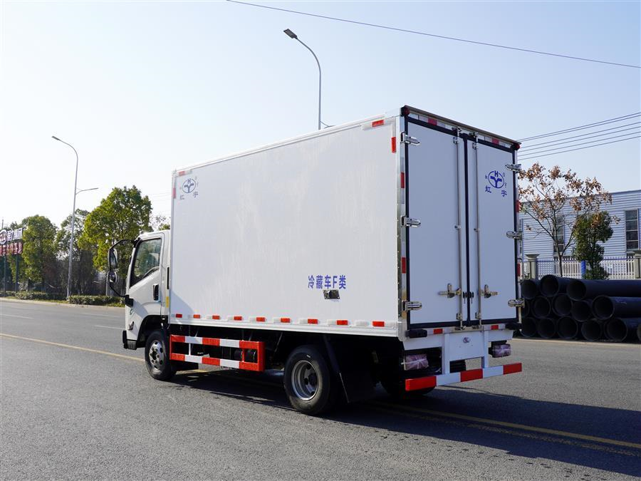 冷藏车厢体为全密封厢板结构,采用完整的2.8mm优质哑光玻璃钢进行板材封闭,具有均衡的结构强度,厢板内部骨架使用断桥隔温处理工艺的加强筋,大幅度提高厢体整体强度;内部填充高密度聚氨酯发泡材料,厢板整体为三明治结构,厢体具有优异的保温特性;