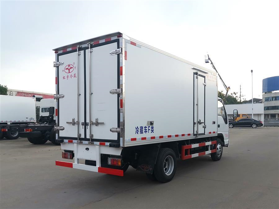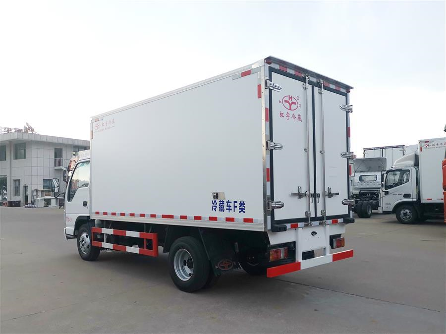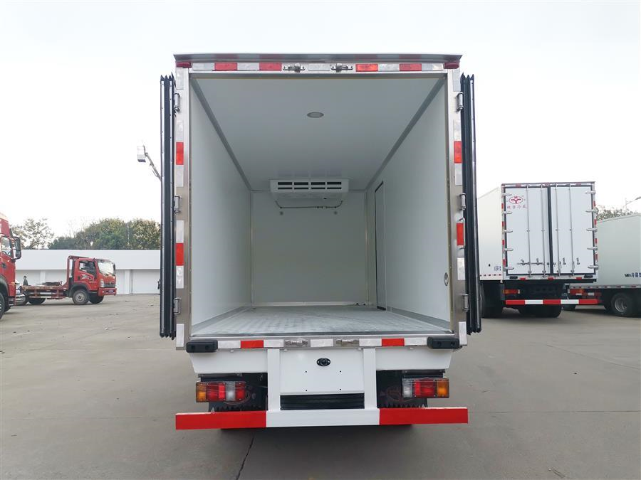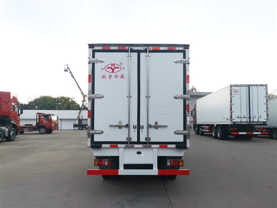 冷藏车厢体为全密封厢板结构,采用完整的2.8mm优质哑光玻璃钢进行板材封闭,具有均衡的结构强度,厢板内部骨架使用断桥隔温处理工艺的加强筋,大幅度提高厢体整体强度;内部填充高密度聚氨酯发泡材料,厢板整体为三明治结构,厢体具有优异的保温特性;
