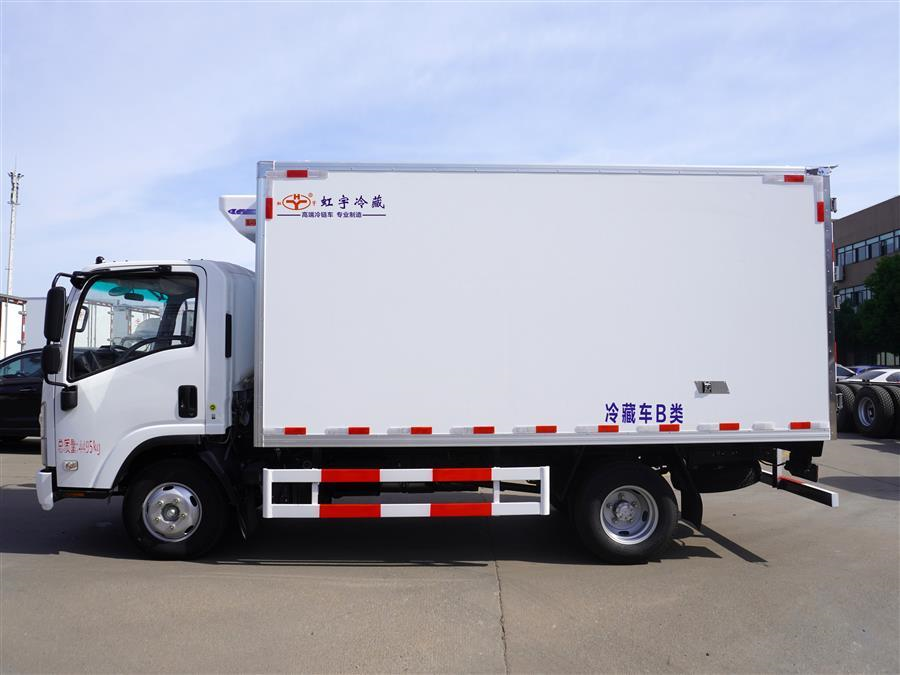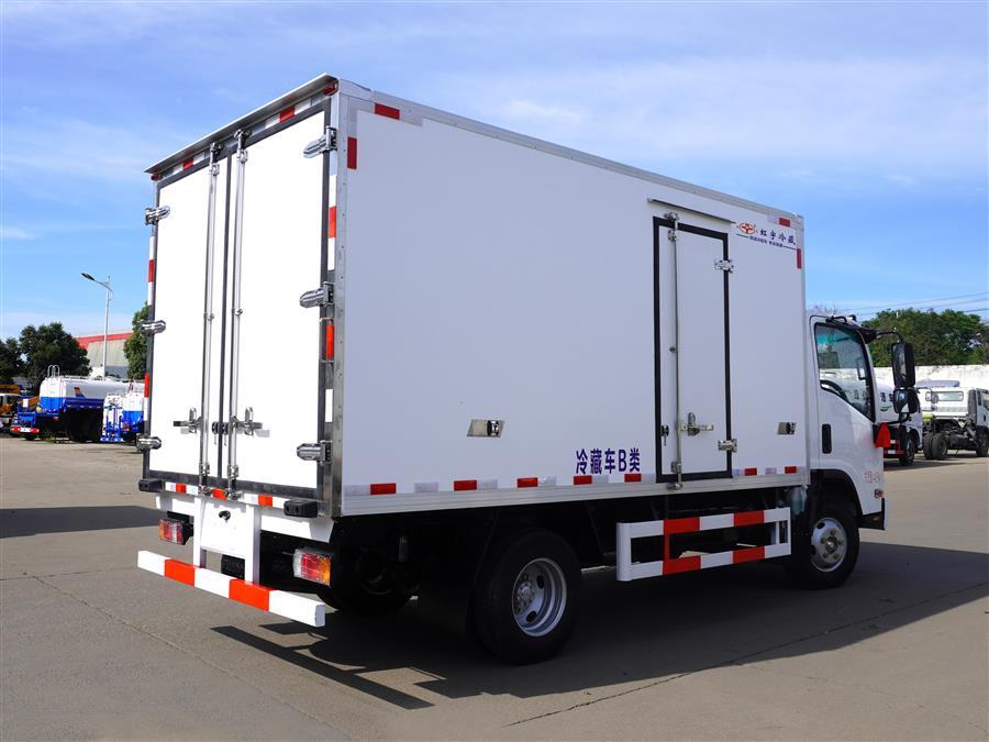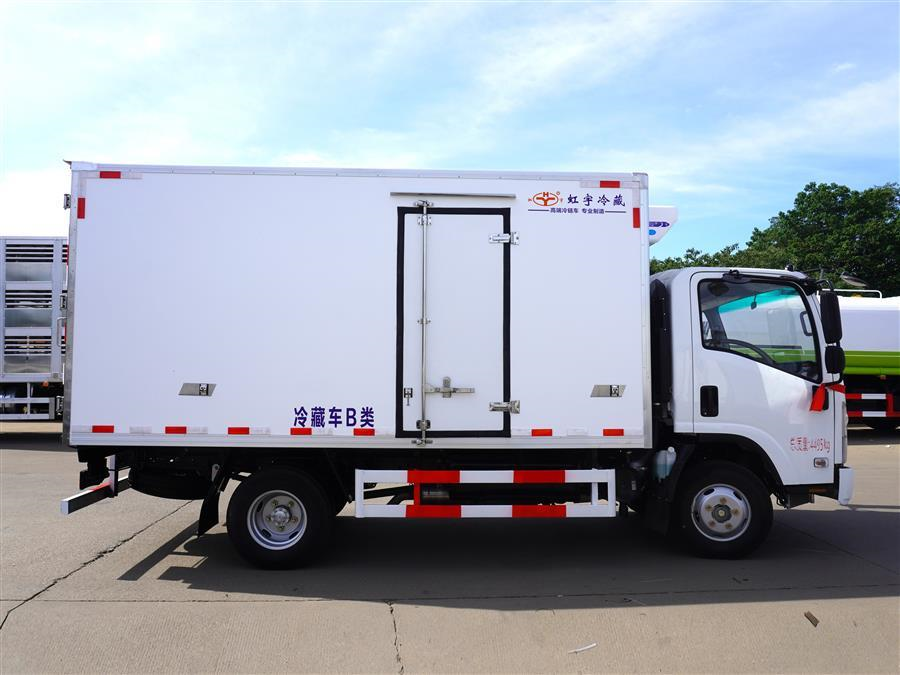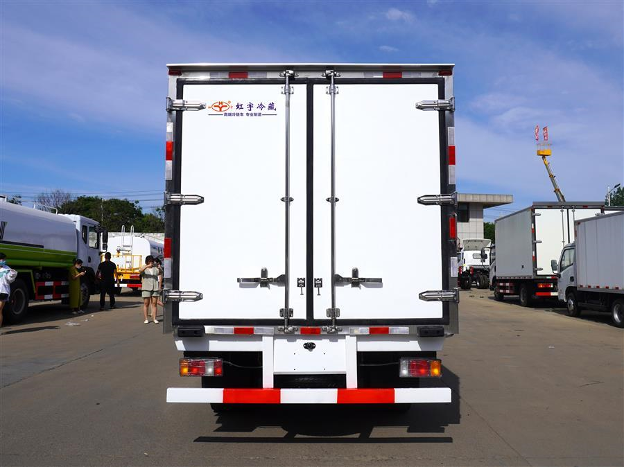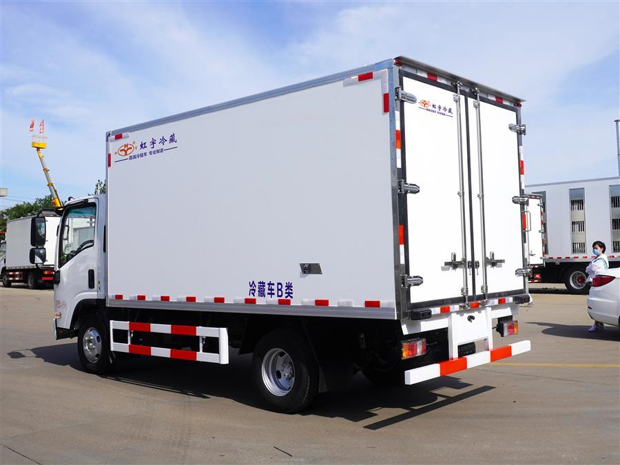 冷藏车厢体为全密封厢板结构,采用完整的2.8mm优质哑光玻璃钢进行板材封闭,具有均衡的结构强度,厢板内部骨架使用断桥隔温处理工艺的加强筋,大幅度提高厢体整体强度;内部填充高密度聚氨酯发泡材料,厢板整体为三明治结构,厢体具有优异的保温特性;