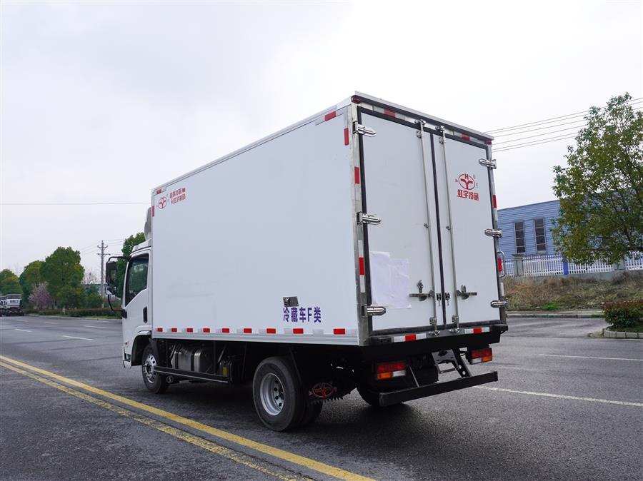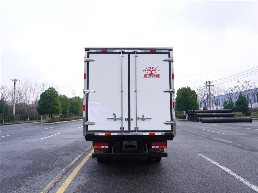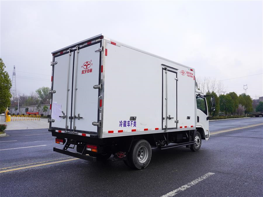 冷藏车厢体为全密封厢板结构,采用完整的2.8mm优质哑光玻璃钢进行板材封闭,具有均衡的结构强度,厢板内部骨架使用断桥隔温处理工艺的加强筋,大幅度提高厢体整体强度;内部填充高密度聚氨酯发泡材料,厢板整体为三明治结构,厢体具有优异的保温特性;