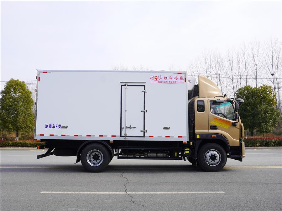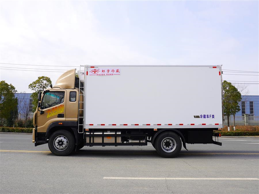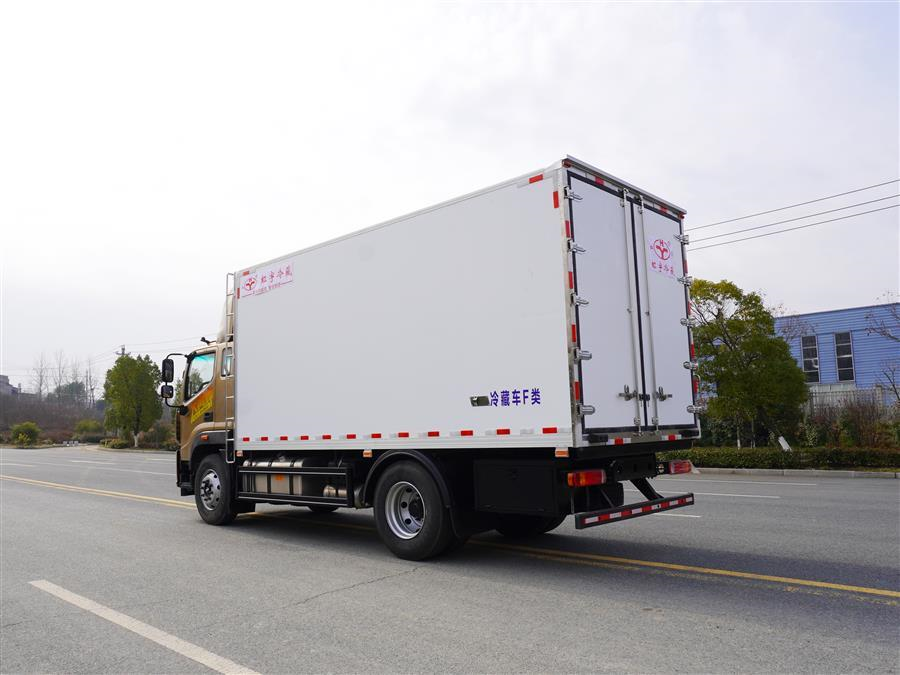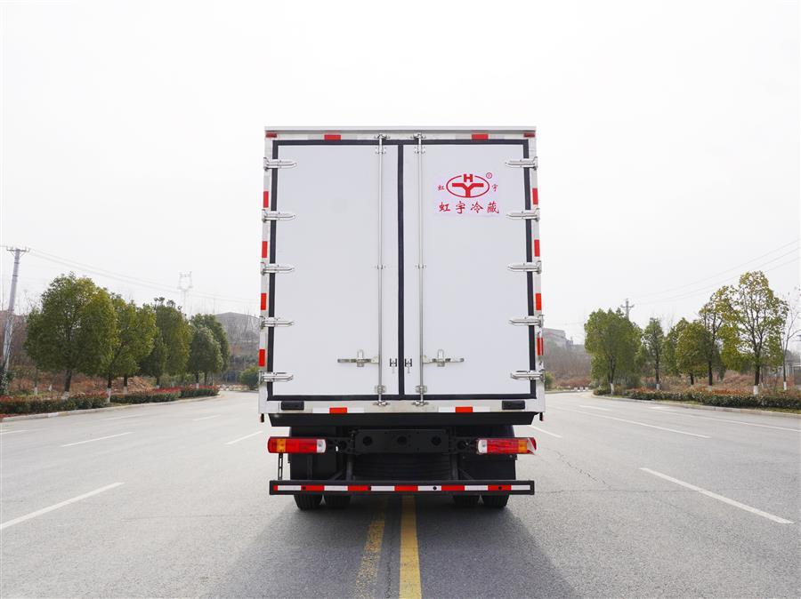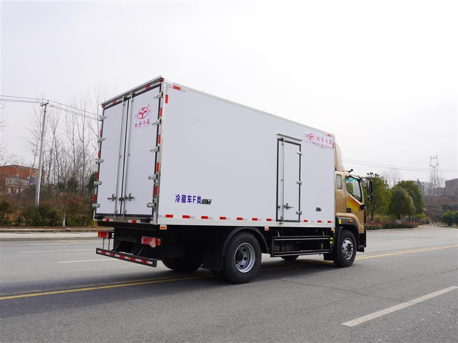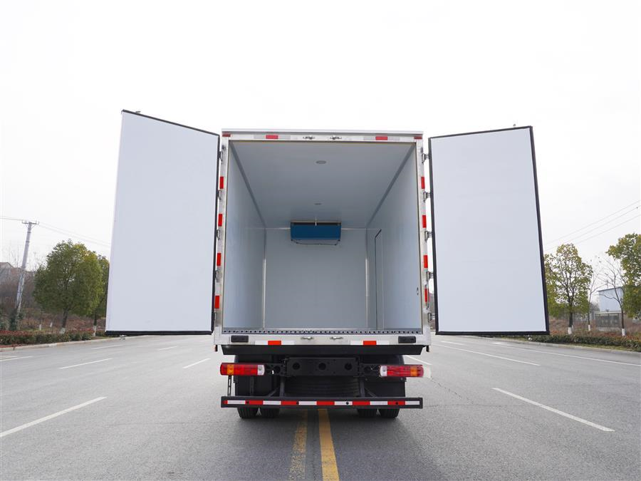 冷藏车厢体为全密封厢板结构,采用完整的2.8mm优质哑光玻璃钢进行板材封闭,具有均衡的结构强度,厢板内部骨架使用断桥隔温处理工艺的加强筋,大幅度提高厢体整体强度;内部填充高密度聚氨酯发泡材料,厢板整体为三明治结构,厢体具有优异的保温特性;