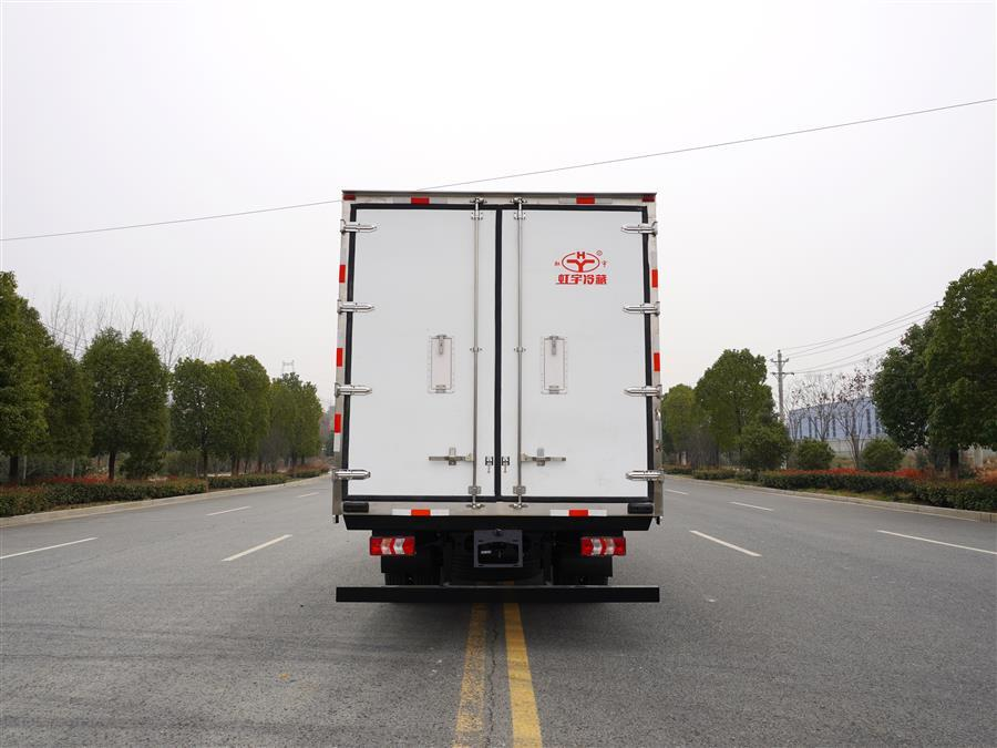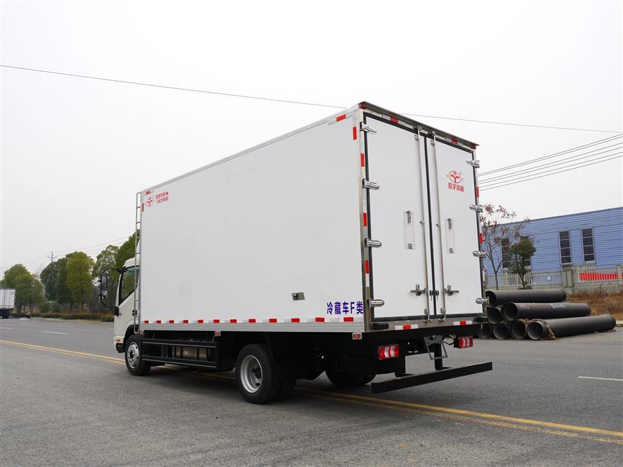 冷藏车厢体为全密封厢板结构,采用完整的2.8mm优质哑光玻璃钢进行板材封闭,具有均衡的结构强度,厢板内部骨架使用断桥隔温处理工艺的加强筋,大幅度提高厢体整体强度;内部填充高密度聚氨酯发泡材料,厢板整体为三明治结构,厢体具有优异的保温特性;